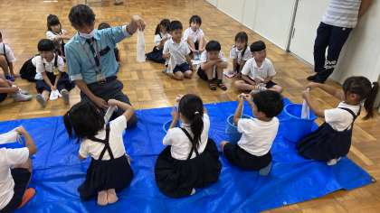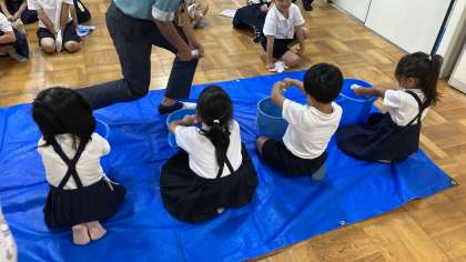 雑巾は一人ずつ実際に絞る体験をしていました。
