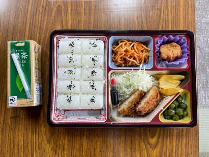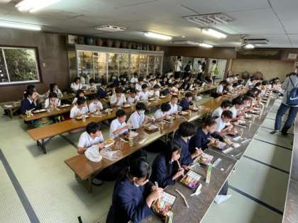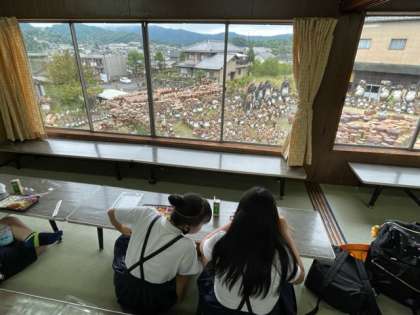 ?宗陶苑さんの大広間で、窓越しにたくさんのたぬきを見ながらのお昼ごはんです。