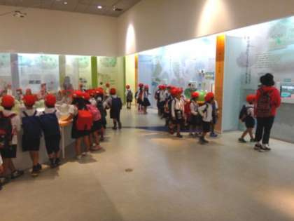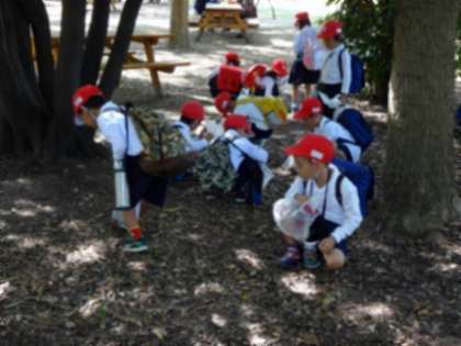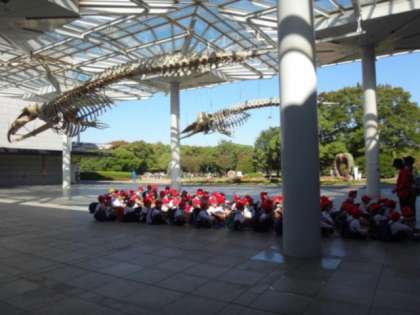 今日は遠足に来ている学校も多く、自然史博物館はうしろから追いやられながらの移動となり、もっとゆっくり見たかったという子どもたちの声が…。でも、お弁当はゆっくりと食べ、どんぐり拾いも行いました。