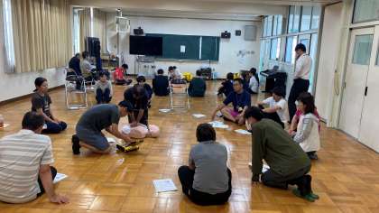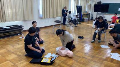 校長先生が講師となり、救命救急講習会を全教員で行いました。