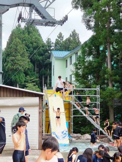 魚つかみの横で子どもたちはウォータースライダーを楽しんでます。