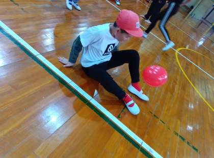 風船を膨らませ、膨らませた風船をお尻で割ります。簡単そうですが、風船が逃げていく〜。意外と難しいな。