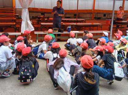 お昼ご飯は自分たちでカレーライスを作ります。飯盒でのご飯の炊き方、野菜の切り方、カレールーの作り方を教わってます。