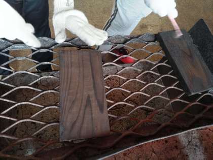 まずは古歯ブラシで煤をおとします。徐々に木目が見えてきます。あらかた煤が落ちたら古タオルで磨きます。磨くほど光沢が出てきます。
