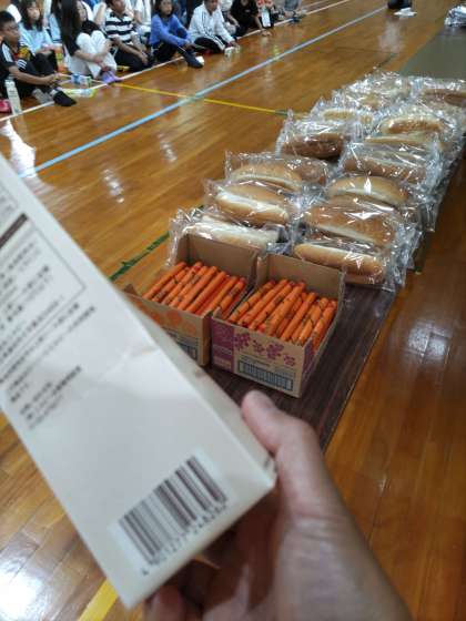 朝食はカートンドックを作ります。アルミ箔を敷いて、パンを置いて、パンの切れ目に野菜とソーセージを挟んで、アルミ箔で包んで、紙パックに入れて、外で紙パックに火をつけて焼きます。