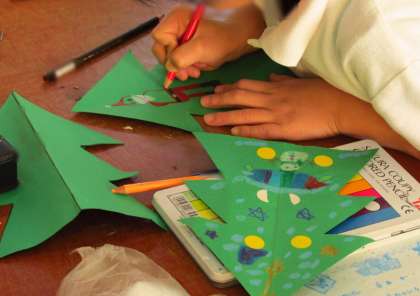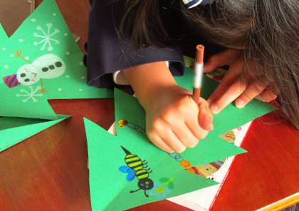 サンタさんやケーキ、雪だるまの絵を描いたり、シールを貼ったり、ひもをボンドでつけたりしていました。素敵なかわいいツリーが完成しそうです。