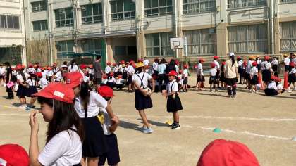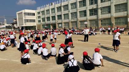 きょうだい学年のグループで、ペア同士の背中にボールを挟んで運ぶゲームをしていました。身長差の大きい1年生と6年生のペアは、背中に挟むのが難しくて苦労していました。