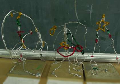 隣りのクラスでは図工科で、針金を曲げたり巻いたり伸ばしたりして、バランスを考えながら立体作品を造っていました。