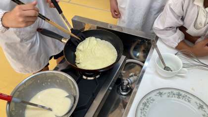 フライパンの上の薄いクレープを裏がえすのがとても大変そうでしたが、6年生を中心に菜箸等を使いながら慎重に行っていました。