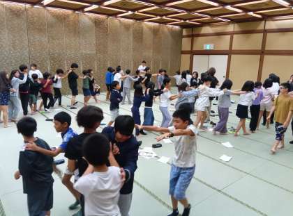 じゃんけん列車が始まりました。。出会った人とじゃんけんをして、負けたら後ろに「つながり」ます。大きな列車ができてます。