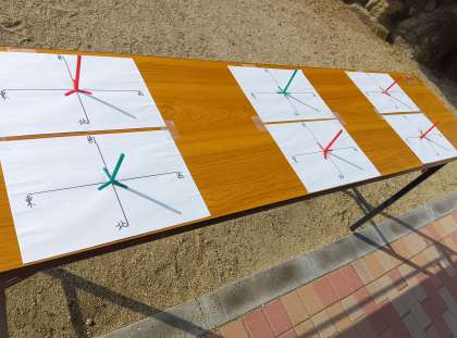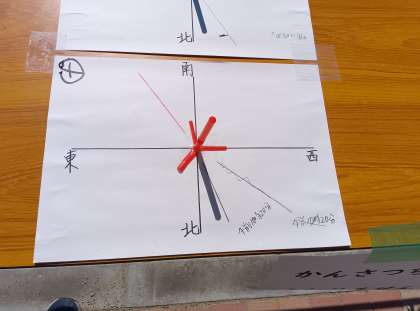 3年生は理科の学習で「太陽の動き」を学んでいます。影のできる向きや長さを記録して、影の反対にある太陽の動きを考えます。普段空を見上げても太陽の動き方までは見えませんが、影を一定時間の間隔で記録していくことで、その記録用紙からは太陽の動きまで見えてくるようです。太陽が東から西へと動いていくことを改めて知り、子どもたちからは「すごい」などの声が聞かれました。
