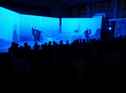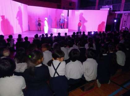 舞台もしっかりと準備され、大きなスピーカーからの迫力ある音楽と舞台に投影される照明や映像とともに劇が進んでいきます。とても楽しい劇で、始まったばかりですが、こどもたちからは歓声や笑い声がどんどん聞こえてきています。