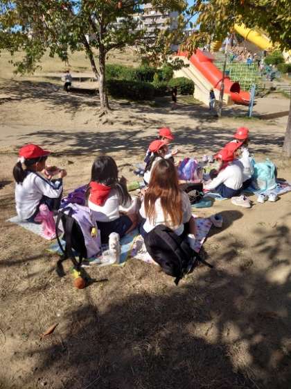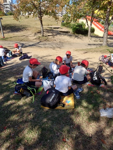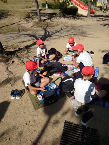 みんなで楽しくお弁当をいただいています。お天気も良く、広い公園でみんなで食べるお弁当はとてもおいしいです。