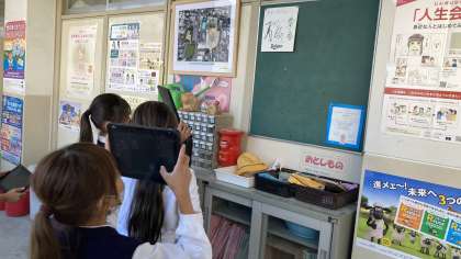 学校にある長方形・正方形・平行四辺形・台形を探してタブレットで撮影してました。