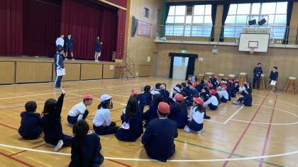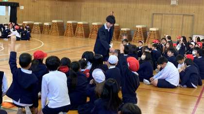 今日は、講堂で2年生と4年生のきょうだい学年で集会をしていました。