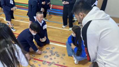 色々な国のあいさつなどを教えていただいた後に、けん玉やお手玉、こま、めんこ、福笑いなど、日本の古くからある遊びを一緒に楽しみました。