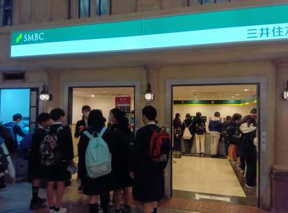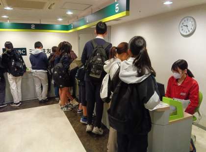 銀行には行列ができています。いろいろな仕事をしてもらった「お給料」を、銀行口座を作って預金できるようです。キャッシュカードも作ってもらえるようです。