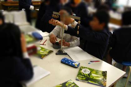 理科室で実験用てこを使って、てこの原理を調べていました。