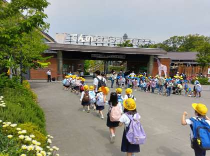 天王寺動物園に着きました。お天気が良く、たくさんの学校、幼稚園が遠足に来ています。