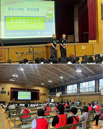 まず1〜3年生は「ぼうさいクイズ」、4〜6年生は区役所の方々の漫才とお話を通して、防災について学びました。しっかりと集中して聞くことができていました。