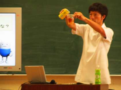 前半は、薬のはたらきや薬を飲むときの約束についての話でした。薬をジュースで飲むと、効き目が変わってしまう場合があることを、実際に実験していただきました。