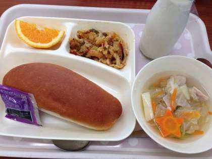 「パエリア、じゃがいものスープ、オレンジ、コッペパン、ブルーベリージャム、牛乳」