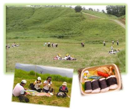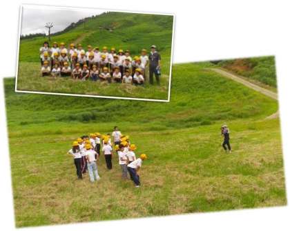 少し曇り空になり歩きやすい中、山頂を目指す中腹でクラス写真を撮りました。一部しんどそうな子もいますが、みんな登ることができました。