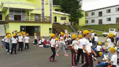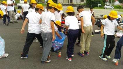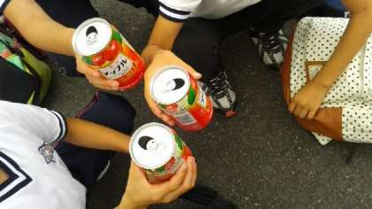 みんな無事下山してきました。とりあえずジュースタイムです。みんなで乾杯をしました。飲んだ空き缶は、踏みつぶして小さくします。