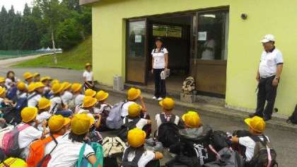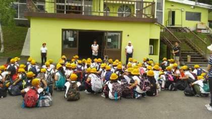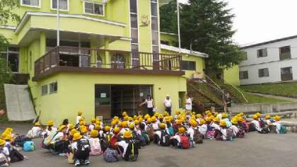 荷物を取ったあと、いよいよ開舎式です。校長先生の話から、児童代表のことば、宿舎の方の話と続きます。この後は、各部屋に入り、避難訓練を行います。