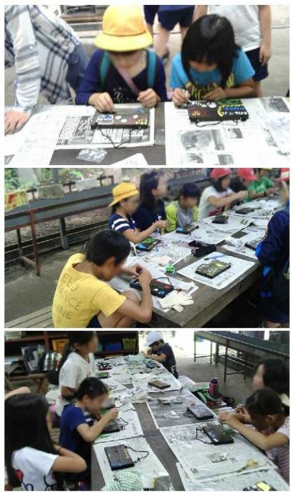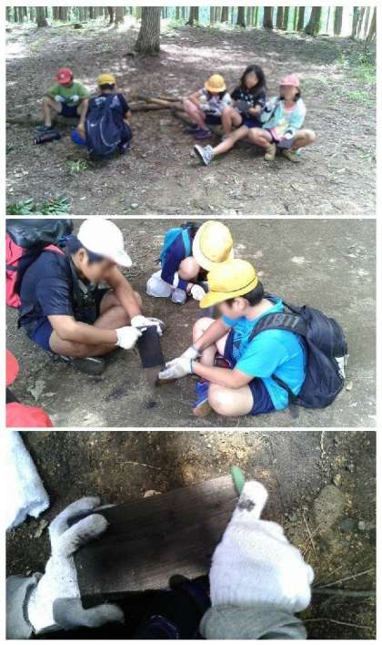 つい先程までも鍋の底についた炭をゴシゴシしていた子どもたち。手慣れたものです。(飯ごうやなべの底にはたっぷりとすすやおこげが付いていて、きれいにならなとなかなか合格できないのです。)