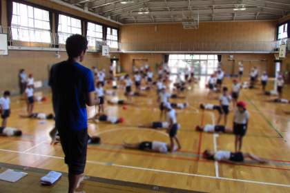 毎日1時間、練習を続けているそうです。今日は音楽に合わせて一人技と二人技をしていました。先生の掛け声もテンポよく出されていました。