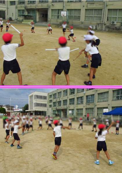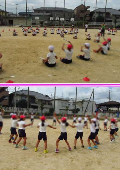 ラップの芯を両手に持って踊るらしいのですが、練習中は代用品でしています。振りが中心なので、今は音がきれいに出ていません。みんなのばち(芯)の音が鳴り響くと、踊りがもっとかっこよくなることでしょうね。