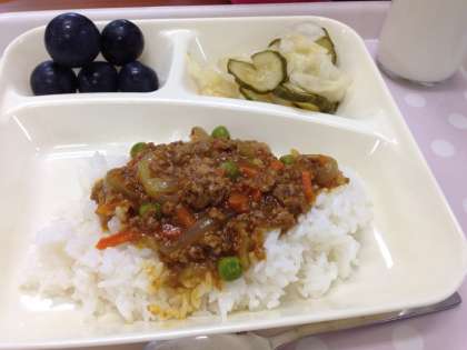 「ドライカレー[米粉]、グリーンサラダ、ぶどう(巨峰)、牛乳」です。