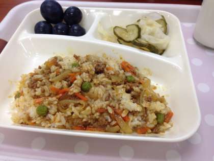 今日のドライカレーで使用したカレールウの素は、小麦粉の代わりに米粉が使われているため、小麦アレルギーのある児童も食べることができます。