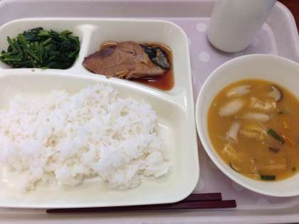 「なまりぶしのしょうが煮、みそ汁、ほうれん草のごまあえ、ごはん、牛乳」です。