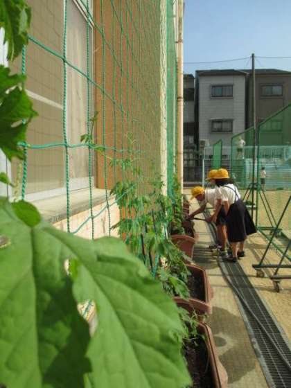 飼育栽培委員会のみなさんが新館のゴーヤの水やりをしてくれています。