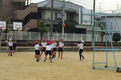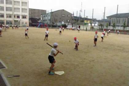 ボール運動クラブは、野球(ソフトボール?)をしていました。軟らかいボールを使ってバットで打っていましたが、4年生の児童やうまく当たらない児童は、代わりにラケットで打っていました。