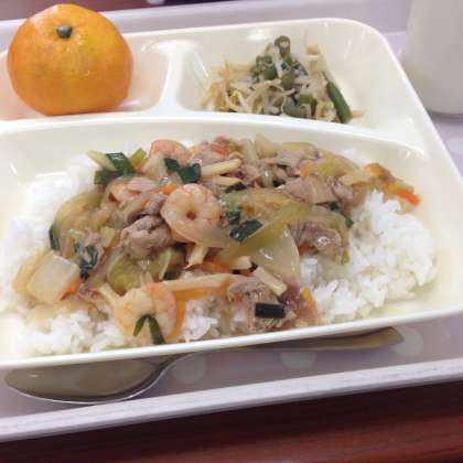 「中華丼、もやしの中華あえ、みかん、牛乳」です。