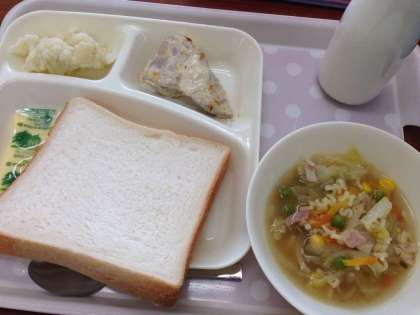 「かつおのガーリックマヨネーズ焼き、マカロニと野菜のスープ、カリフラワーのサラダ、食パン、マーガリン、牛乳」です。