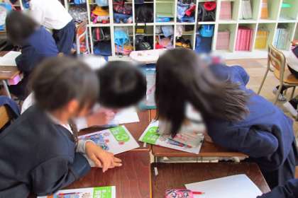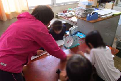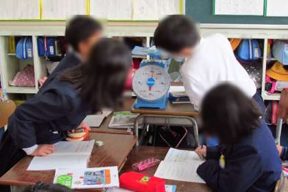 班ごとにはかりを使って筆箱や教科書などの重さを量りました。目盛りを読むのが難しく班のみんなで相談し合って考えていました。