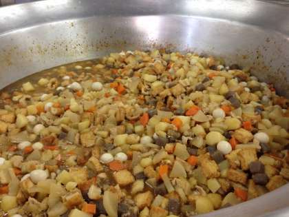 関東煮には、だいこん、あつあげ、うずら卵、こんにゃくなど、たくさんの具が入っています。