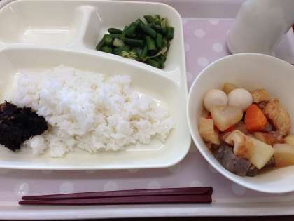 「関東煮、三度豆のからしあえ、のりのつくだ煮、ごはん、牛乳」です。
