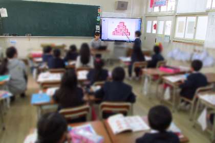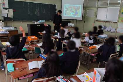 途中、クイズを出し合っている姿を先生が写真に撮って大きくスクリーンに映しました。「相手の子の方をきちんと向いて、相手の子の目を見て発表したり聞いたりすることが大切ですね」と確かめていました。