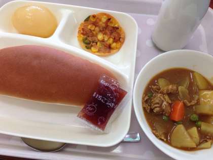 「豚肉とだいこんのカレー煮、変わりピザ、白桃(缶)、コッペパン、いちごジャム、牛乳」です。