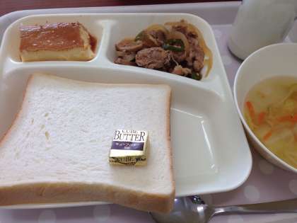「豚肉のケチャップソテー、はくさいのスープ、焼きプリン、食パン、バター、牛乳」です。