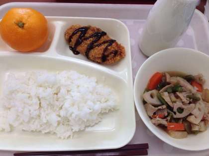 「まぐろのフライ、豚肉とだいこんの煮もの、みかん、ごはん、牛乳」です。