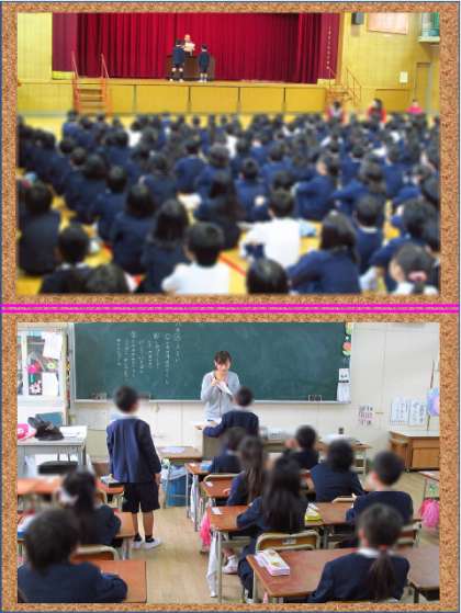 講堂での式では、校長先生や生活指導の先生から話を聞いたり、コンクールなどで表彰を受けた児童が校長先生から披露してもらったりしました。