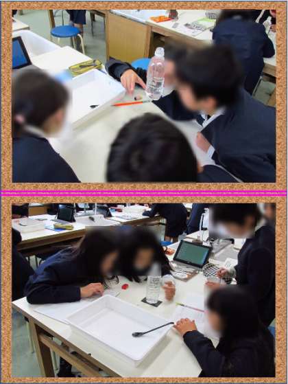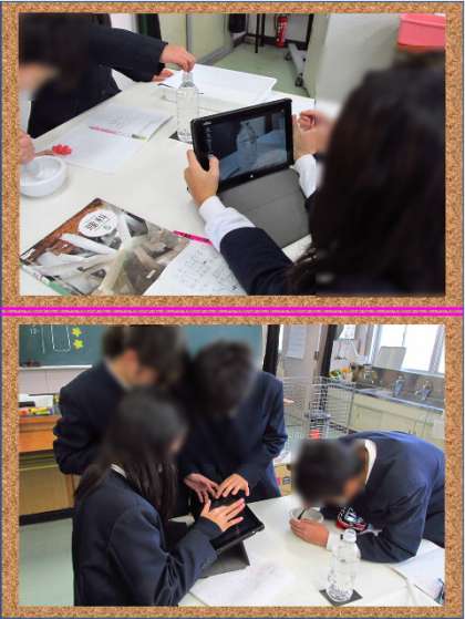 今回は班に1台ずつタブレットパソコンを使っていました。食塩が水に溶ける様子を写真に撮ります。