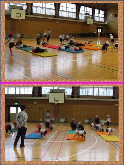講堂では隣りのクラスがマット運動をしていました。かえる跳びや横振り跳び、横向きに回転するなど、いろいろしていました。