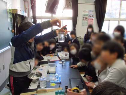 溶けるときの様子について班で意見が違ったので、もう一度前に集まって先生の実験を目の前で観察して確認していました。